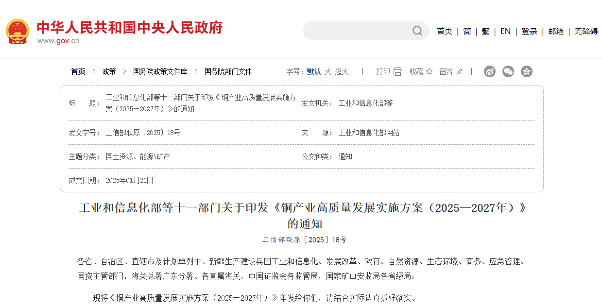 工業(yè)和信息化部等十一部門關(guān)于印發(fā)《銅產(chǎn)業(yè)高質(zhì)量發(fā)展實(shí)施方案(2025—2027年)》的通知工信部聯(lián)原〔2025〕18號各省、自治區(qū)、直轄市及計(jì)劃單列市、新疆生產(chǎn)建設(shè)兵團(tuán)工業(yè)和信息化、發(fā)展改革、教育、自然資源、生態(tài)環(huán)境、商務(wù)、應(yīng)急管理、國資主...